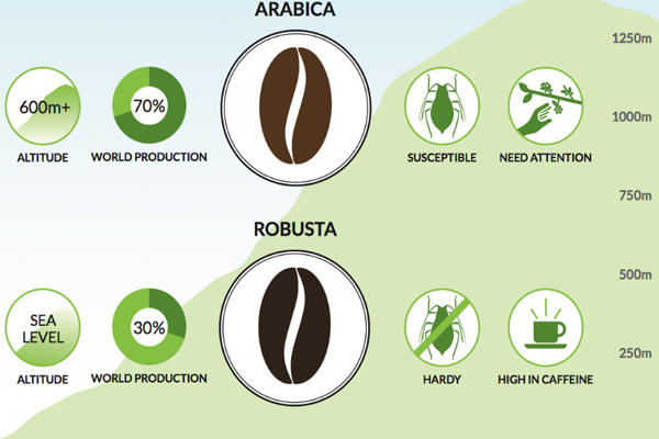 Các cây bụi cà phê Arabica thường có chiều cao từ 2,5 - 4,5 mét, đòi hỏi nhiệt độ từ 15° -24°C và lượng mưa hàng năm khoảng 1200 - 2200 mm/năm. Trong khi Robusta mọc hơi cao 4,5 - 6,5 m, đòi hỏi phải có một nhiệt độ cao hơn 18° - 36°C và lượng mưa nhiều hơn một chút (2200 - 3000 mm/năm) so với Arabica. Arabica thường cũng mang lại sản lượng thấp hơn so với Robusta, điều này có nghĩa là chi phí làm Arabico cao hơn so với Robusta trong sản xuất. Chính vì vậy mà nhiều nhà sản xuất đã thêm Robusta khi sản xuất Arabica để giảm chi phí và tăng lợi nhuận.