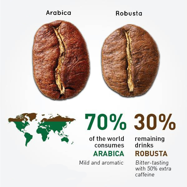 Hàm lượng cafein trong hạt cà phê Arabica chỉ có 1.5%, trong khi hàm lượng này ở hạt Robusta rất cao: 2.5%